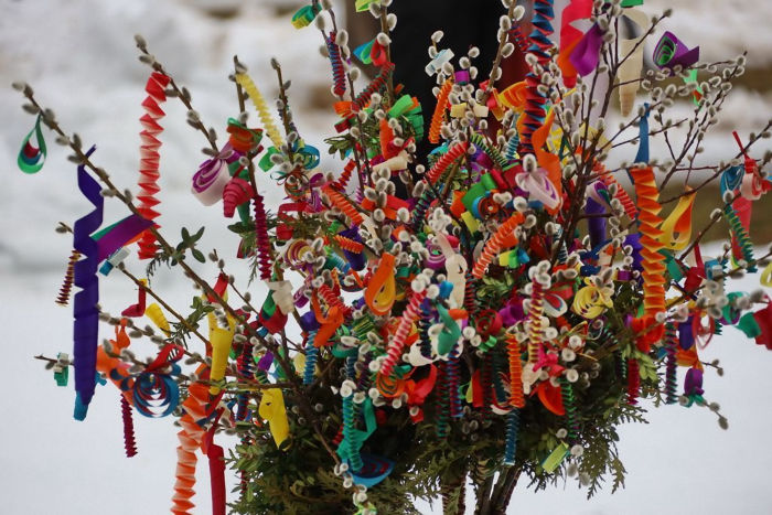 Der Palmsonntag bringt erste Farbtupfer - Palmweihe am Sonntag vor Ostern. In den Wochen vor Ostern finden in Berchtesgaden und im Rupertiwinkel umfangreiche Vorbereitungen in den Familien und auf den Bauernhöfen statt. Die Väter schneiden Weidenäste, besorgen Zweige und binden die "Palmbuschen", die Mütter und größeren Kinder basteln den Palmschmuck aus "Gschobertbandln", gefärbten Hobelspänen, die im Gedenken an den Einzug Jesu in Jerusalem, noch heute am Palmsonntag von den Kindern zur Kirche getragen und dort gesegnet werden.